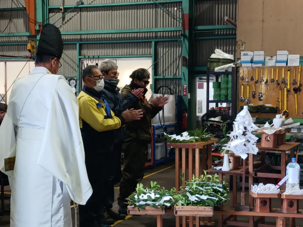 祭壇には海や山の幸をお供えし、厳かな雰囲気の中で玉串を奉奠いたしました。ものづくりの現場において「安全」は何よりも優先されるべき基盤です。